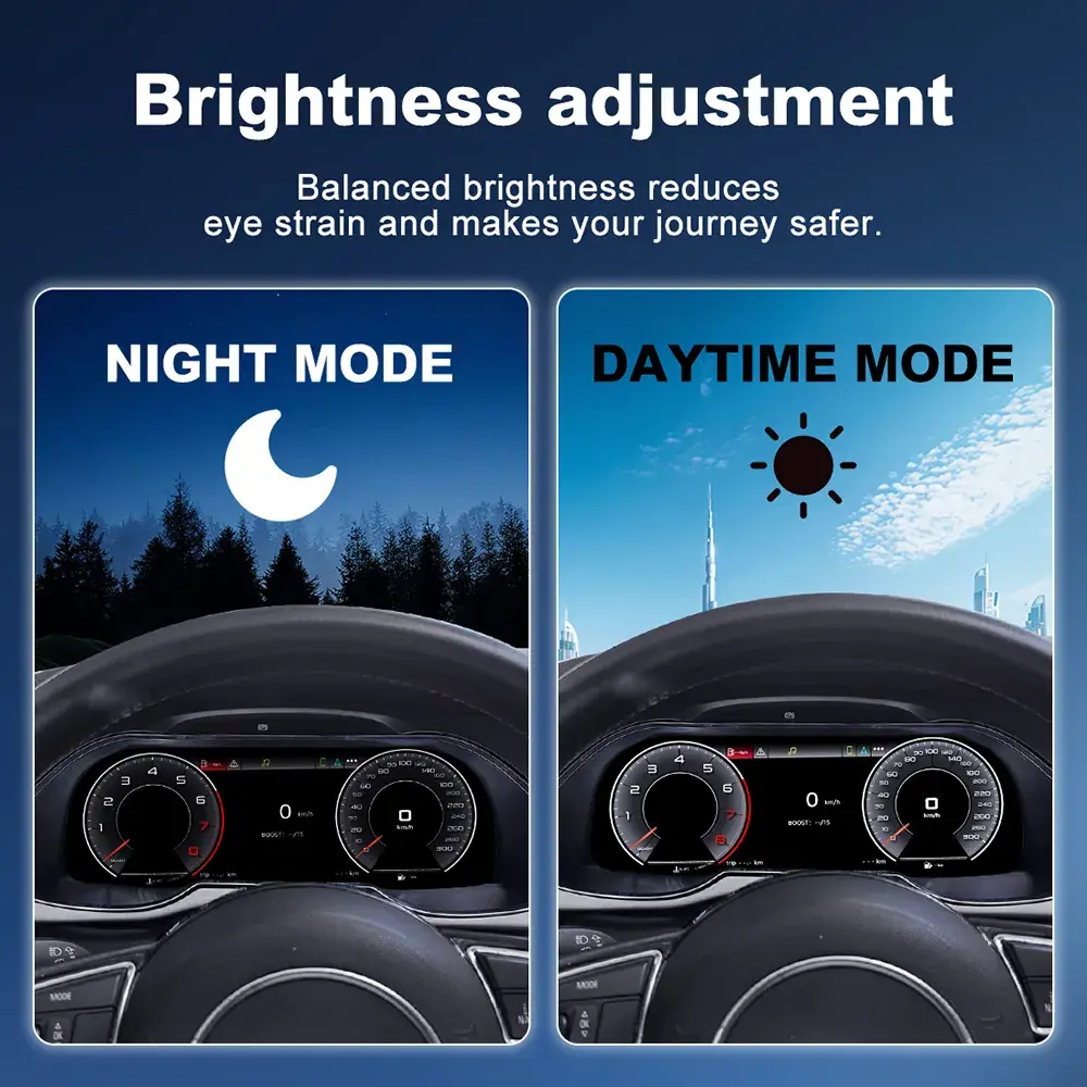 Drive comfortably in any light. The system includes an intelligent light sensor that automatically switches between Day and Night modes, balancing brightness to reduce eye strain and ensure road safety.