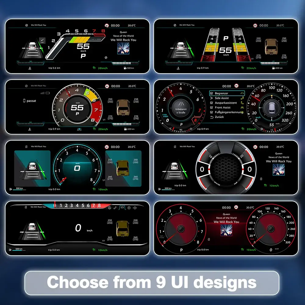 Customization without limits. Switch between 9 deeply customized UI styles, ranging from classic Volkswagen aesthetics to futuristic sporty layouts, breaking all factory constraints.